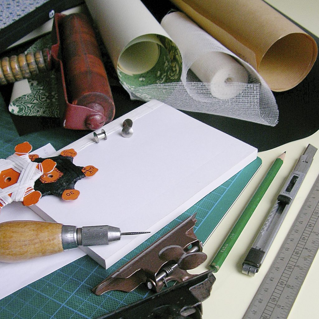 Ihr bindet ein kleines Buch oder ein Leporello und erstellt aus Moosgummi und einem Holzblock einen Stempel Eurer Wahl dazu.